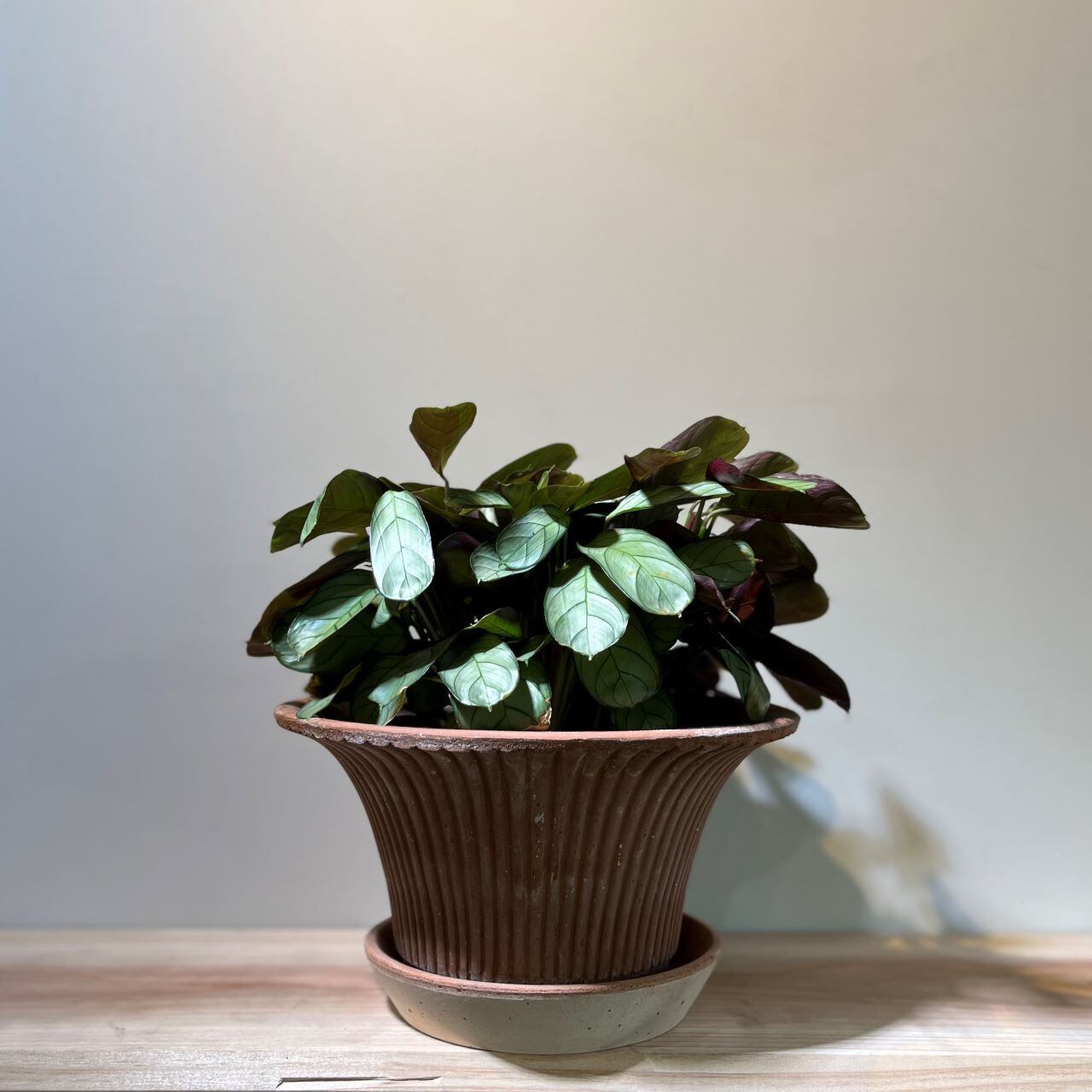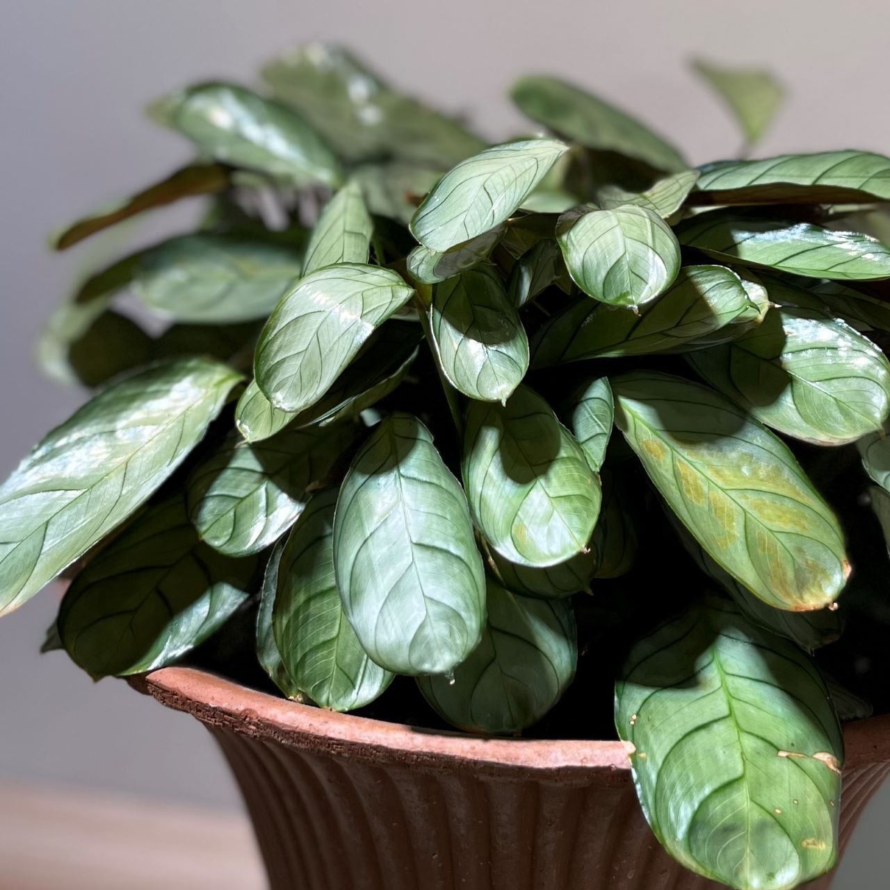 表面のツヤツヤとした葉が美しく、裏側は紫色がかった色合いのクテナンテ・アマグリス。